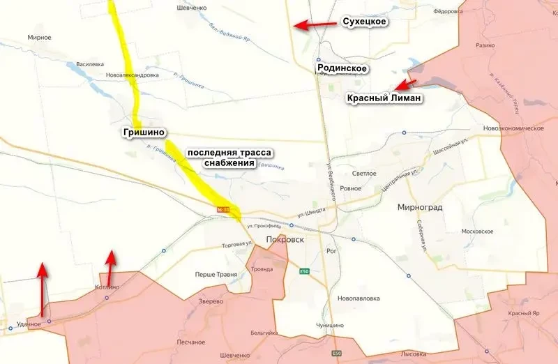 Ранее сообщалось, что наши взяли шахту «Краснолиманская» и начали бои за шахту «Родинская» у восточной окраины Родинского, пытаясь зацепиться за улицу «Шахтерской славы» и войти в город с востока. Также наши взяли Сухецкое, перерезав трассу Доброполье — Покровск, это признают и украинские ресурсы. На данный момент у противника осталась одна дорога, по которой еще можно вести снабжение, проходящая через Гришино.