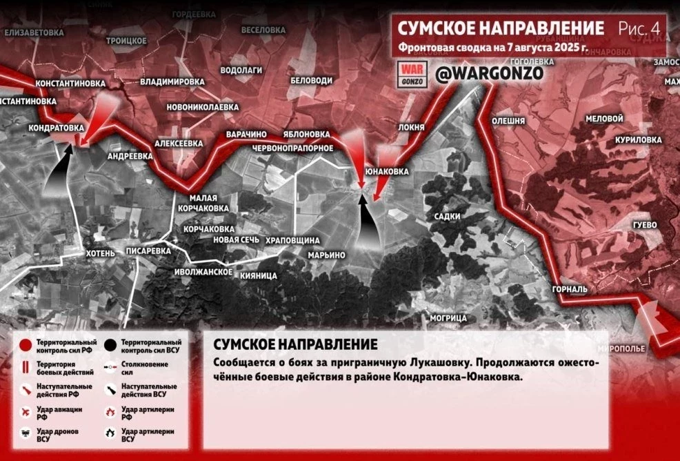 На Сумском направлении сообщается о боях за приграничную Лукашовку. Продолжаются ожесточённые боевые действия в районе Кондратовка–Юнаковка.
