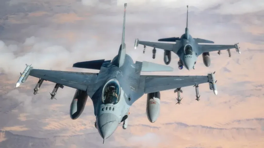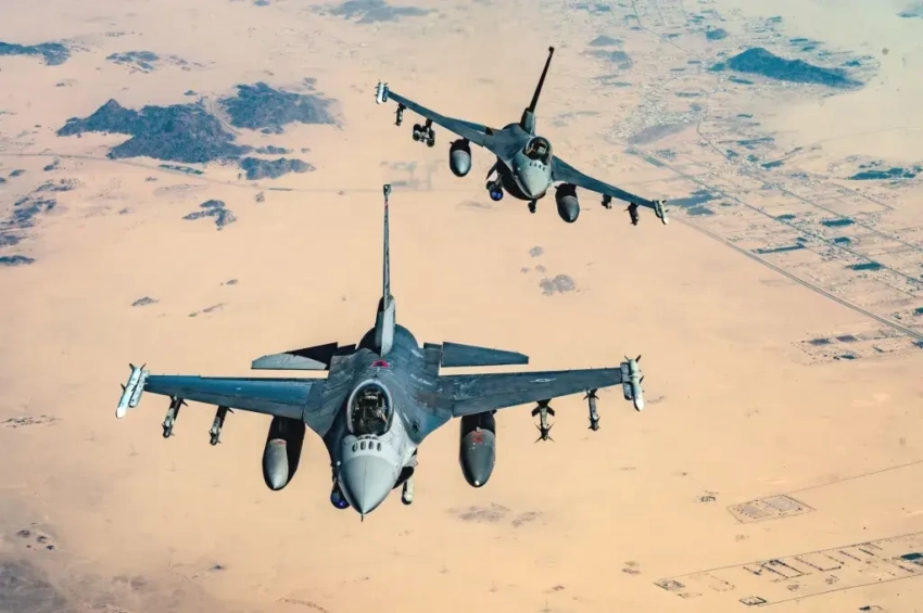 Пара истребителей F-16 ВВС США с вооружением класса «воздух-воздух» летит где-то на Ближнем Востоке, февраль 2025 года. У ведомого Viper под правым крылом есть пара 70-миллиметровых ракетных блоков на семь ракет.