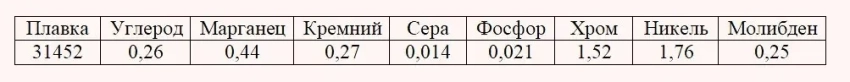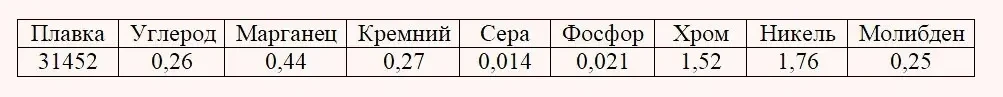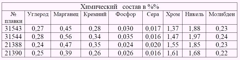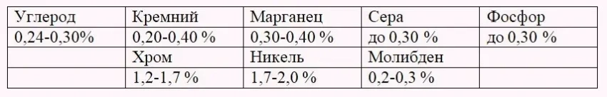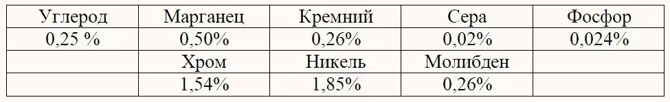 Углерод — 0,25%; кремний — 0,26%; марганец — 0,50%; сера — 0,020%; фосфор — 0,024%; хром — 1,54%; никель — 1,83%; молибден — 0,26%.