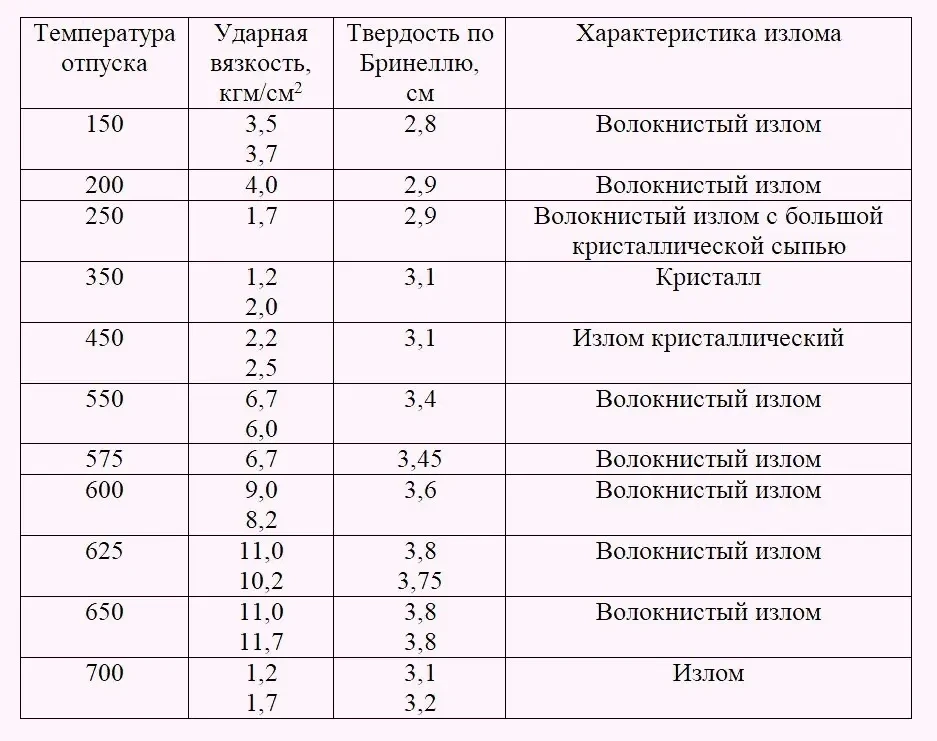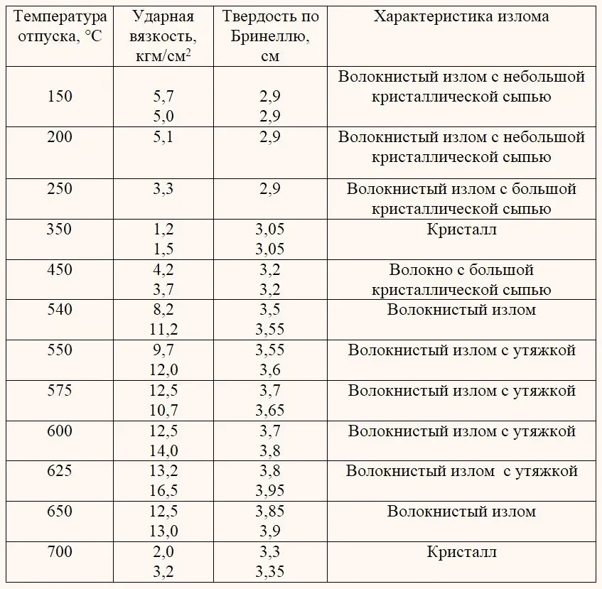 Данные таблицы показывают, что, начиная с температуры 250°C до 500°C, наблюдается резкое понижение ударной вязкости, доходящее до 1,2–1,5 кгм/см2 при температуре отпуска 350°C.