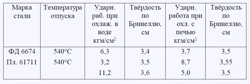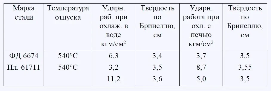 С целью проверки влияния охлаждающей среды на ударную вязкость образцы подвергались следующей термической обработке: образцы типа Менаже из стали плавки 61711 и стали марки ФД 6574 закаливались при температуре 840–850°C в воде, затем подвергались отпуску при температуре 540°C с последующим охлаждением в воде и в печи.
