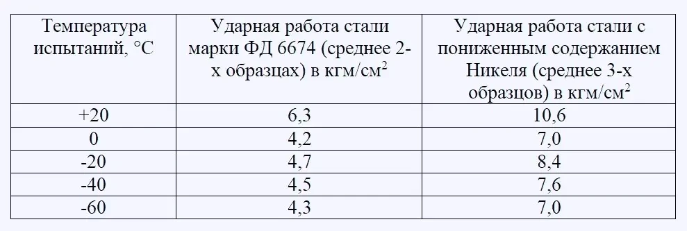 Иллюстрировать ударную вязкость большим количеством образцов не представилось возможным из-за отсутствия материала. В дальнейшем все последующие плавки с пониженным содержанием никеля будут проверены на ударную вязкость при пониженных температурах.