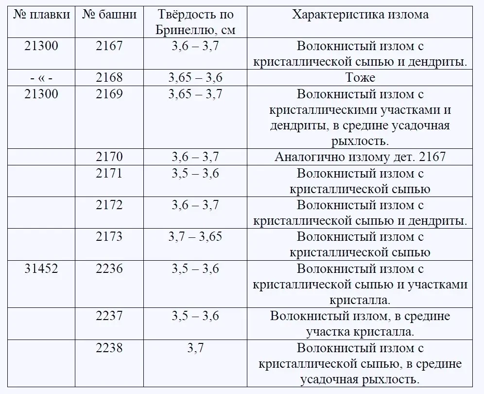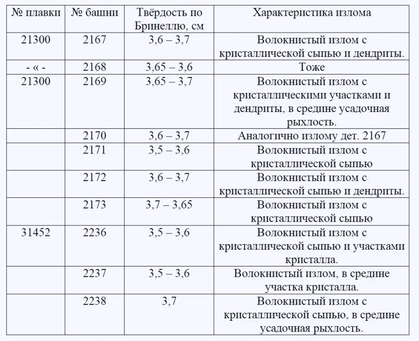 Одна башня № 2236, пл. № 31452, подвергалась двойной закалке, т. к. в производстве разрешалось обрабатывать башни по двум режимам:
