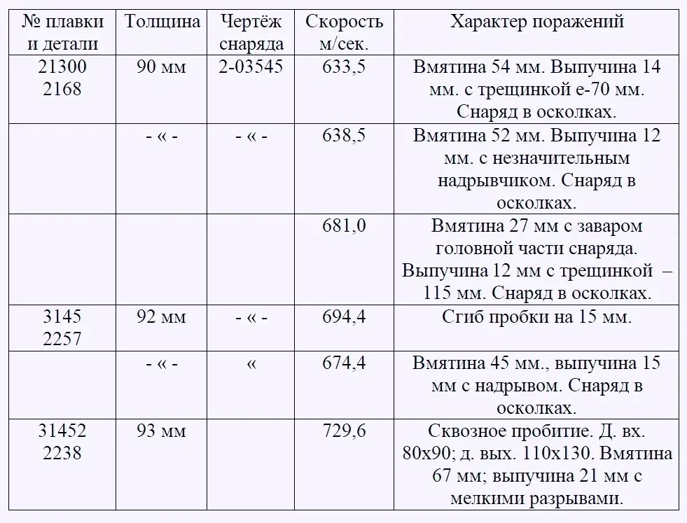 4. Вязкость данной опытной башни не ниже ранее испытывавшихся литых башен марки стали ФД 6674, установленная обстрелом 76-мм снарядом.