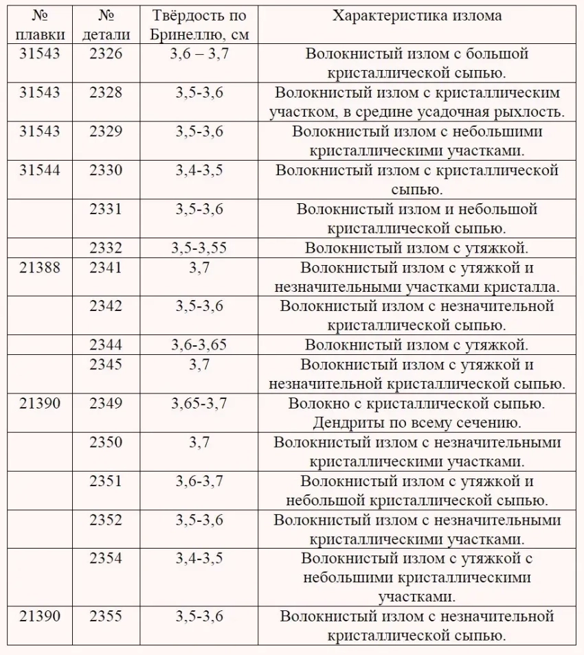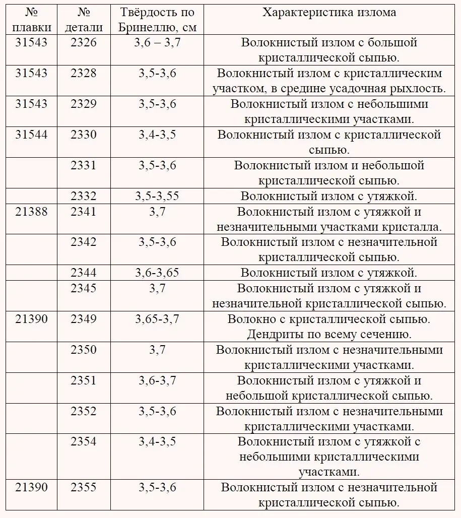 Характеристика излома твёрдости деталей плавок 31543, 31544, 21388, 21390