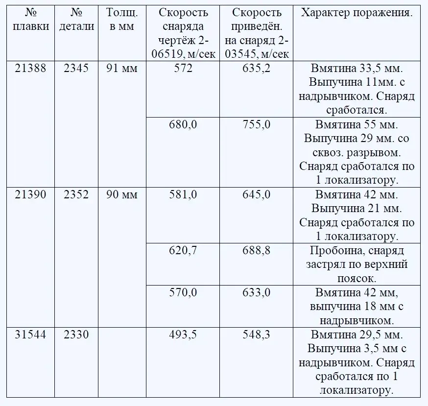 3. Бронестойкость кормовой части башни в местах, находящихся выше убранных прибылей, несколько ниже бронестойкости лобовой и бортовых частей башни, но находятся в пределах, предусмотренных временными ТУ.