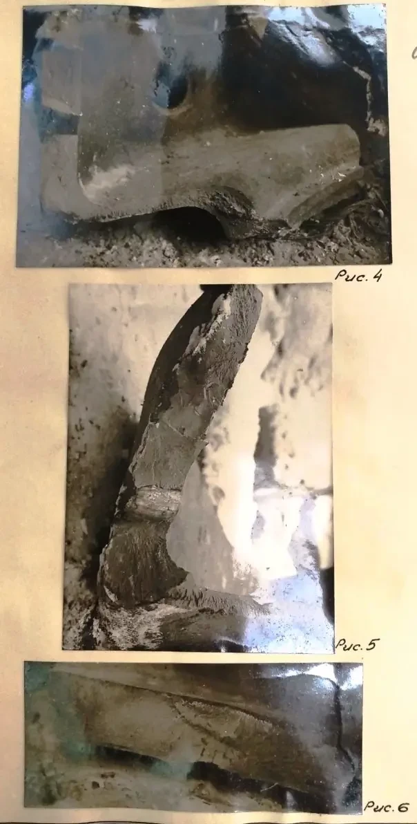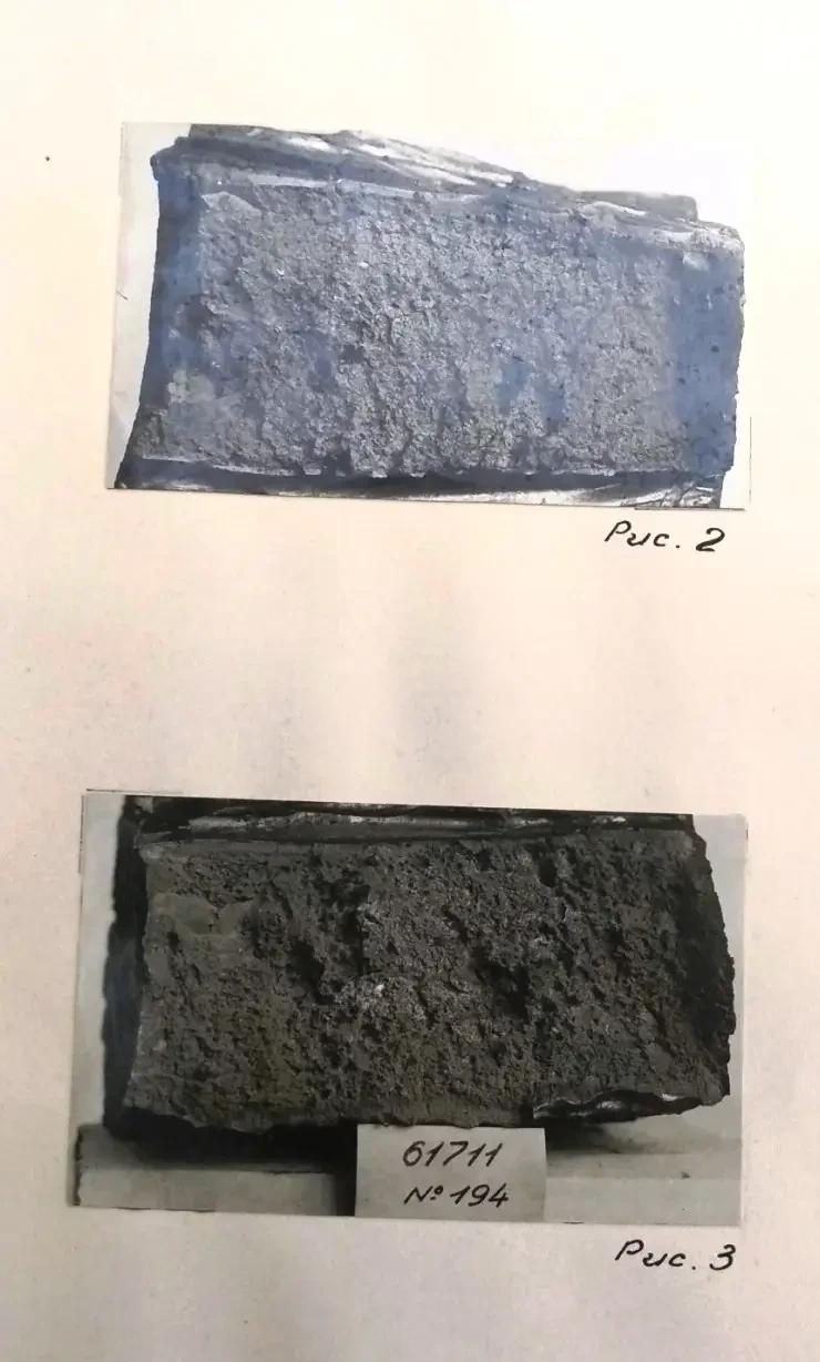 После полигонных испытаний башня была разрушена под копром с целью проверки наличия усадочной рыхлости в местах отсутствия прибылей на нише. Соответствующие изломы приведены на рис. №№ 3, 4, 5. Как следует из их рассмотрения, рыхлости не обнаружено, но излом несколько суховат.