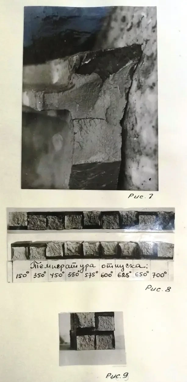 3. Вязкость данной опытной башни не ниже ранее испытывавшихся литых башен, изготовленных из стали марки 6674, при испытании снарядом 76 мм, но при пониженных температурах опытная башня дала трещину и пролом от 85 мм снаряда при скорости 800 м/сек. на дистанцию 330 м, что характеризует резкое падение вязкости.