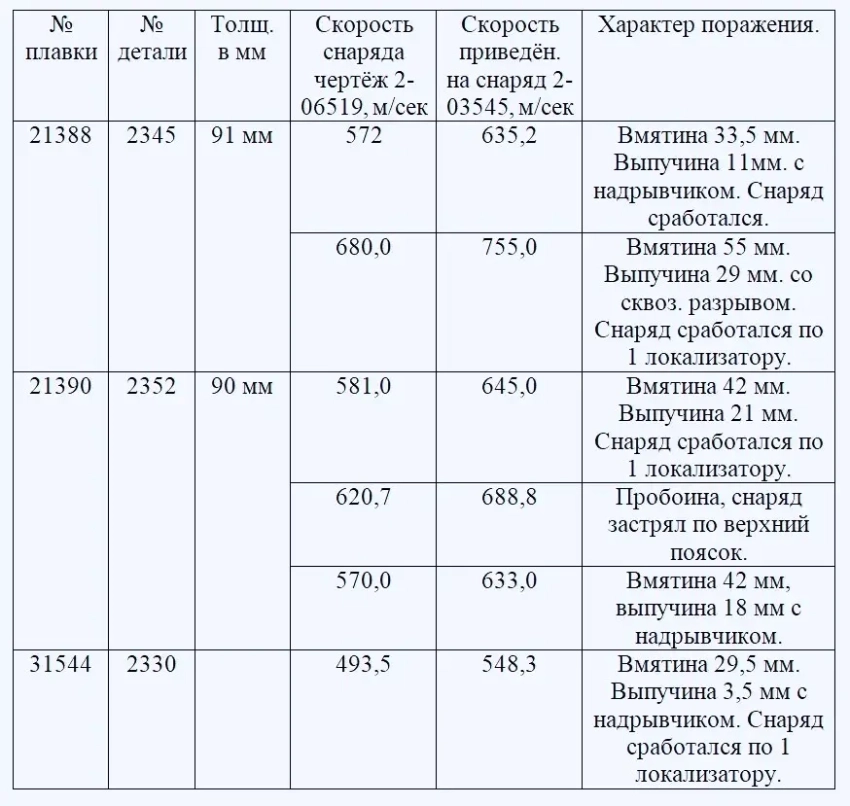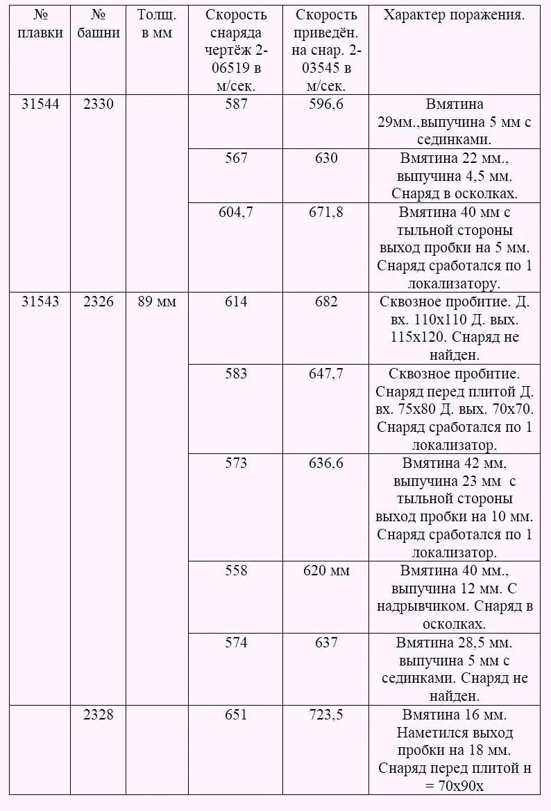 2. Полученные скорости при испытании снарядом 2-06529 свидетельствуют о том, что лобовая часть башни, бортовая и кормовая превышают штатную скорость 76-мм пушки, равную 650 м/сек. снаряда чертежа 2-03545 при переводном коэффициенте 0,89.