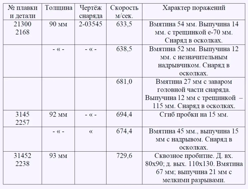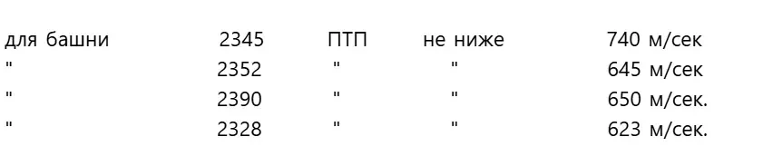 1) Скорость при пределе тыльной прочности (ПТП) соответствует требованиям технических условий 630–640 м/сек снарядом черт. 2-03545.