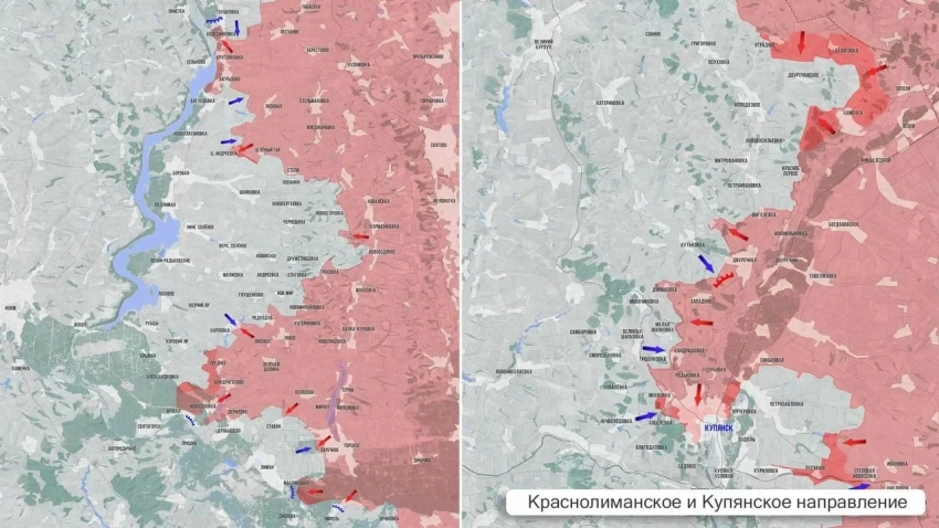 Российские штурмовые группы пробились в сам город Красный Лиман на двух участках юго-восточной окраины, где сейчас идут ожесточенные встречные бои. Севернее наши бойцы вышли на южные окраины Богуславки, где в этот раз удалось закрепиться в жилой застройке, создав плацдарм для дальнейшего штурма. Противник пытается контратаковать в Загрызово.