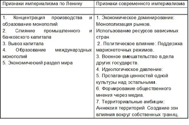 Прежде чем говорить об империализме на современном этапе, давайте посмотрим на признаки империализма, описанные в работе Владимира Ильича Ленина, и признаки империализма в современной трактовке. Итак, перед нами таблица: