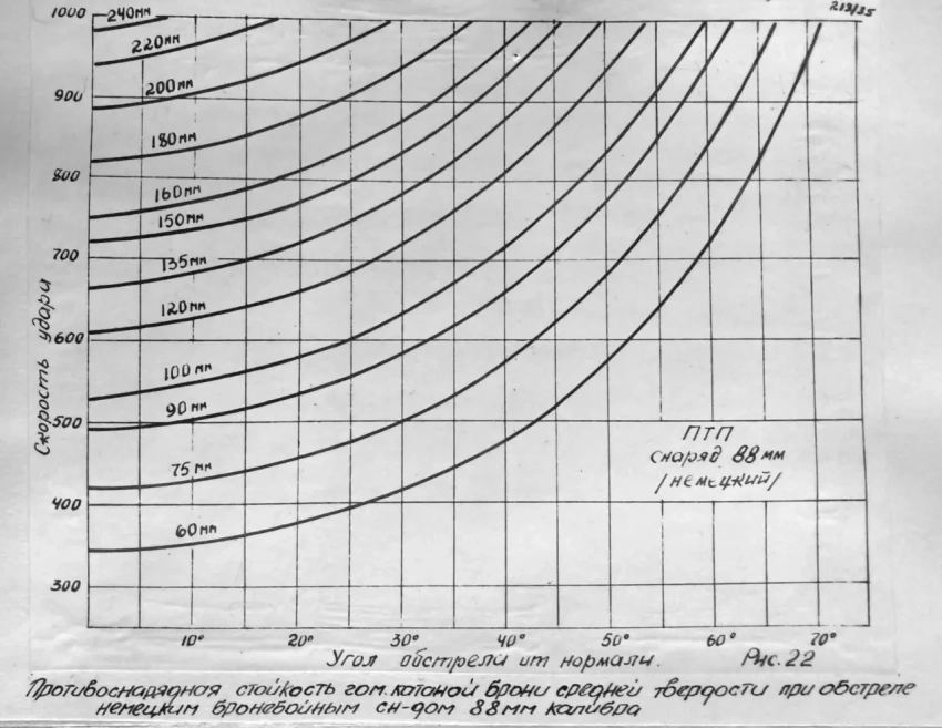 1) Бронепробивное действие немецких и отечественных снарядов крупного калибра (88–152 мм) по гомогенной броне средней твёрдости весьма эффективно лишь при обстреле по нормали или при небольших углах встречи от нее. При этих условиях испытания бронебойные снаряды при скоростях встречи с броней около 1000 м/сек. способны пробить броню толщиной в два с лишним раза превышающей калибр снаряда.