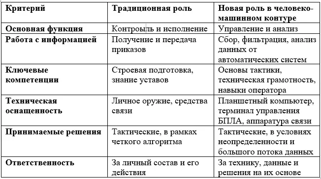 Таким образом, происходит сдвиг от модели «сержант-исполнитель» к модели «сержант-оператор-аналитик», который становится ключевым элементом в контуре управления, обеспечивающим связь между техническими средствами разведки и управления и командиром, принимающим решения.