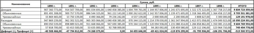 Следовательно, дефицит Российской империи без учета заимствований составил 194,5 млн. руб. Сумма получилась куда более скромная, но все равно приходится констатировать – в 1890-е годы Империя жила не по средствам.