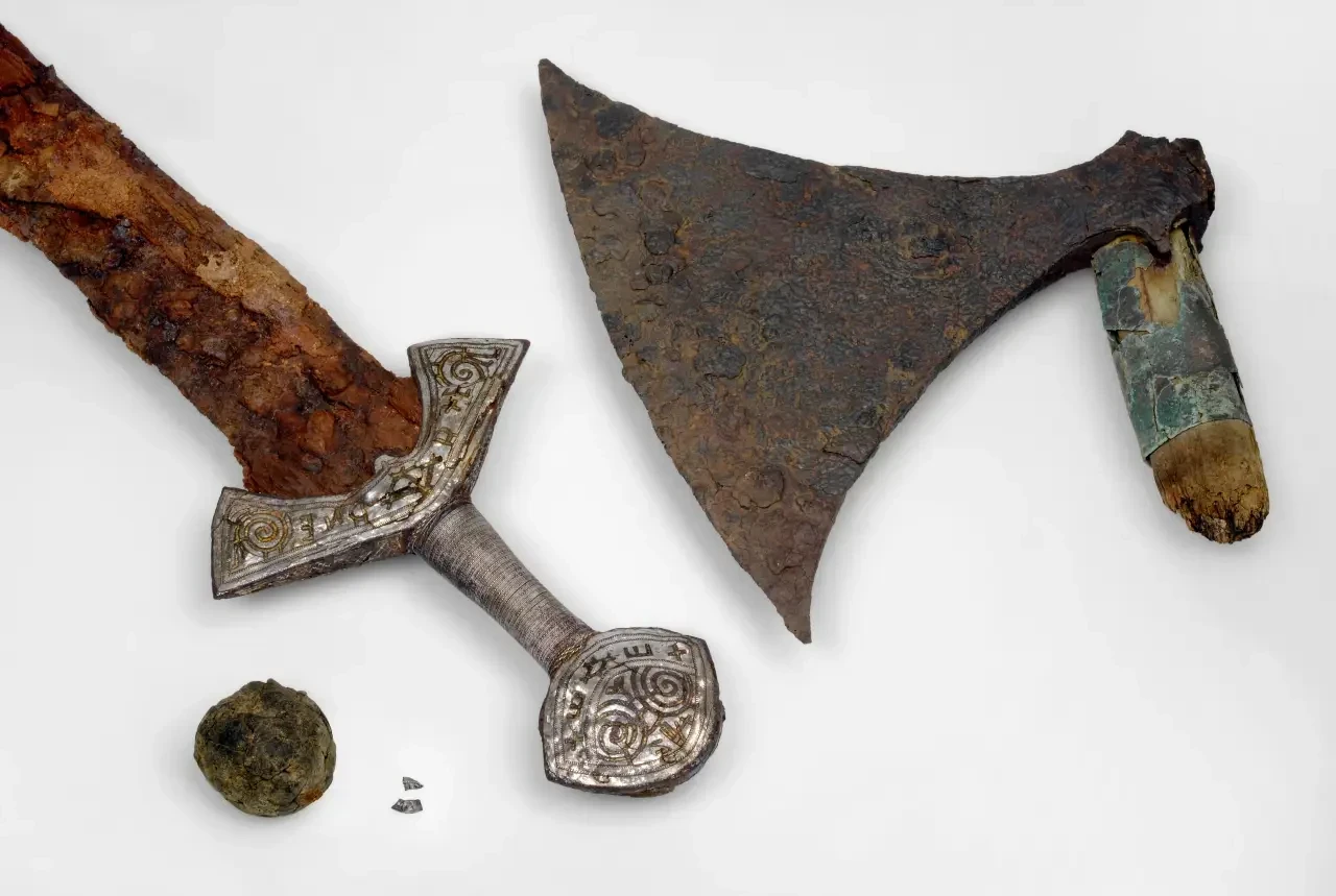 Находки в могиле знатного викинга, обнаруженной Ларсом Гьермундбю: меч, наконечник ножен, наконечники стрел, полумаска от шлема, остатки кольчуги, два топора, две половинки от купола шлема и два наконечника копья, один узкий, другой широкий. То есть, скорее всего, именно таким был арсенал состоятельных воинов-норманнов эпохи викингов. Исторический музей университета Осло
