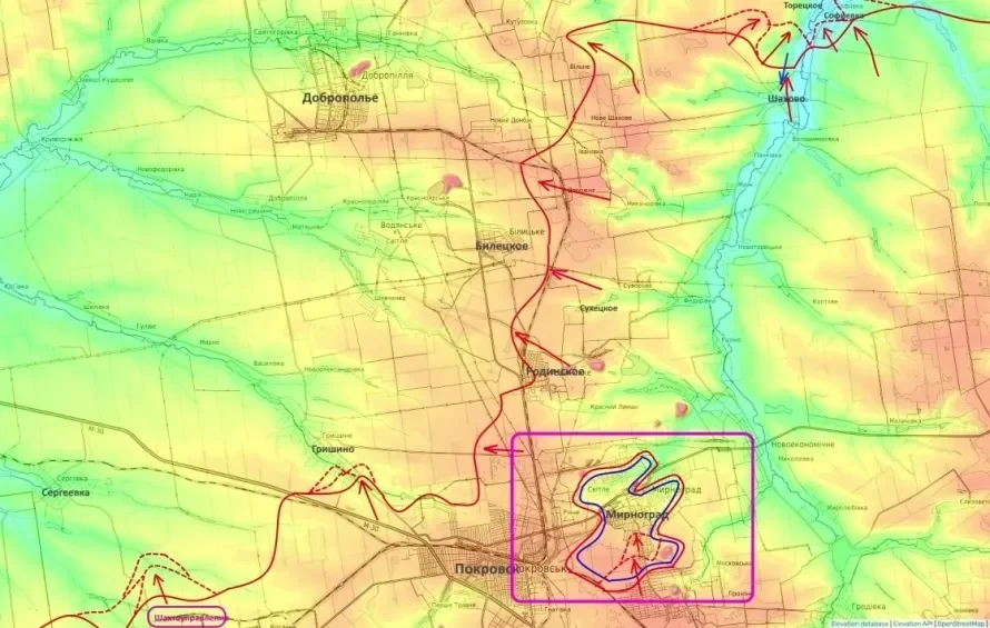 Параллельно идут ожесточённые бои за Новоподгороднее и Гришино. В последнем российские десантники освободили южную часть села и ведут бои в центре, что угрожает последним маршрутам снабжения ВСУ в Мирнограде.
