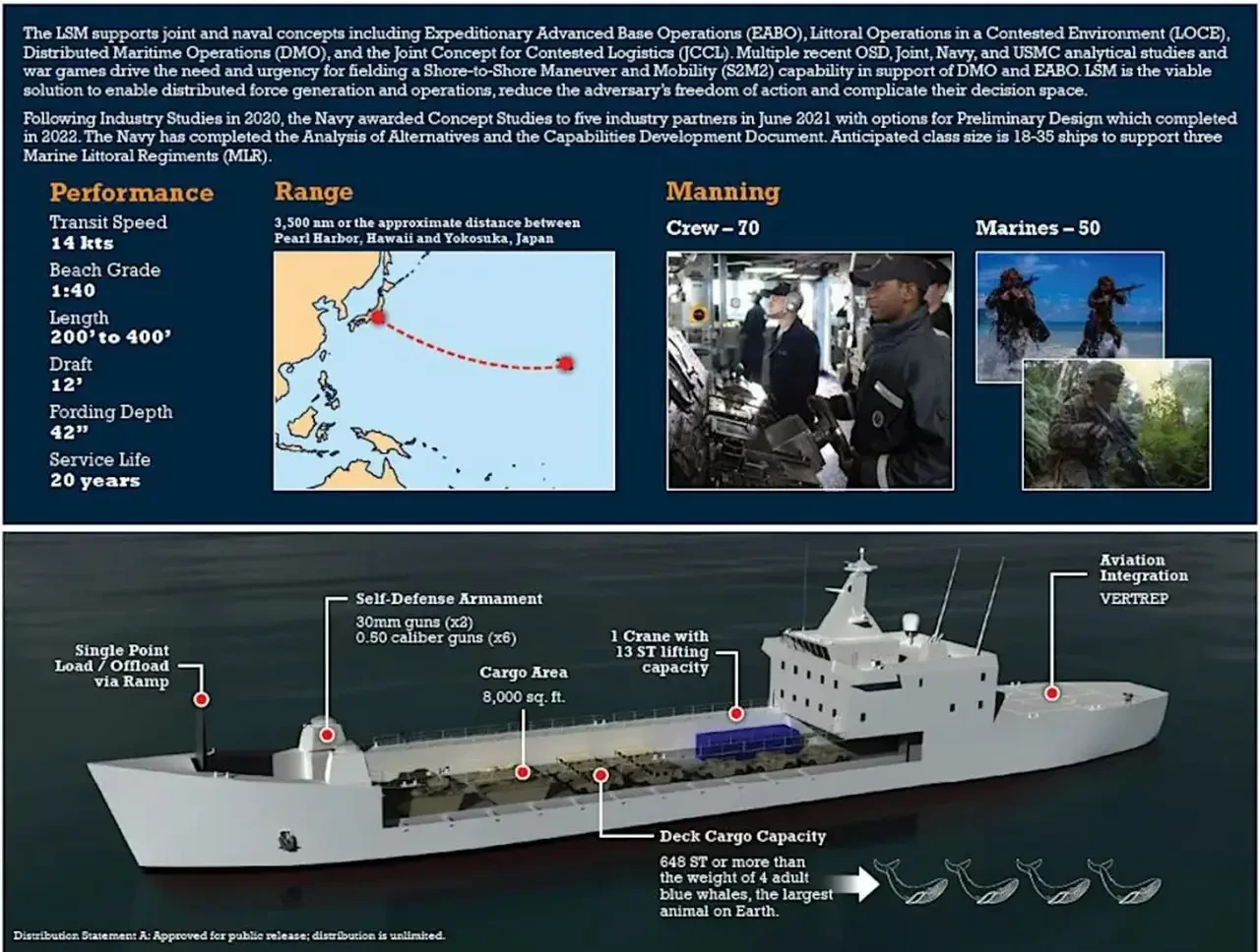 Для этого на протяжении многих лет ВМС и Корпус морской пехоты пытались получить новый класс вымпелов. Сначала эта программа называлась LAV («лёгкий десантный корабль»), затем LSM («средний десантный корабль»), но она была отменена в декабре 2024 года. Причины этого выбора озвучил адмирал Дэрил Кодл: