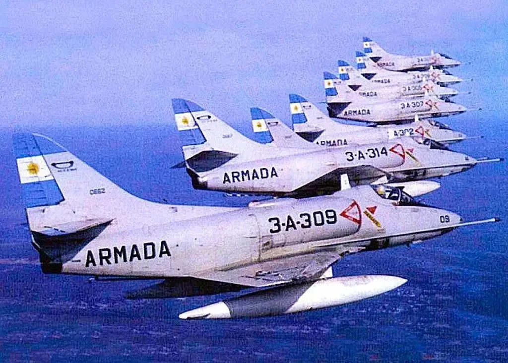Неплохо? Но это ещё не всё! Потому что свои ВВС были у аргентинского военно-морского флота. 1-я эскадрилья морской авиации имела на вооружении 6 самолётов «Аэрмакки» МВ.339А, учебно-тренировочных и одновременно лёгких штурмовиков. 2-я эскадрилья морской авиации/штурмовая эскадрилья стала основным ударным подразделением: у неё на вооружении стояло 4 французских штурмовика «Супер Этандер». 3-я эскадрилья использовала 8 «Скайхоков» модели А-4Q — палубной версии, используемой с авианосца «25 мая», бывшего английского «Венерабль», 1944 года постройки.
