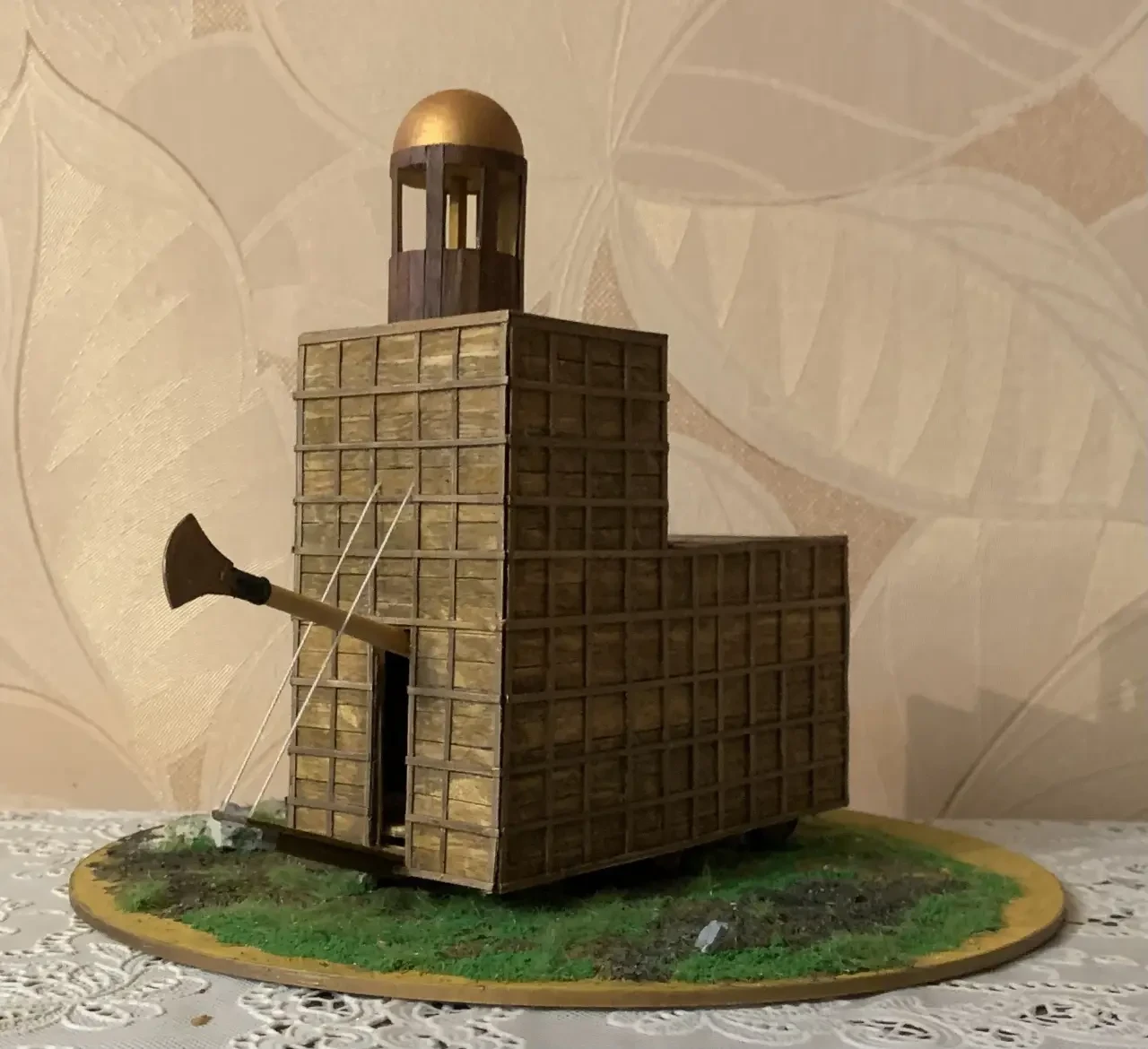 Вырезаем эти полоски шириной 2 мм, красим в бронзовый цвет и наклеиваем их в соответствии с рисунком сначала вдоль, а затем поперек. Либо сначала поперек, а потом вдоль – особой роли это не играет. По сути, модель тарана готова. Остается только поставить ее на красивую подставку – подиум. В нашем случае под руками оказался диск из полистирола толщиной 5 мм. Слой земли на нем имитировался из смеси гипса, клея ПВА и акриловых красок. Потом, добавив клея, ее посыпали «травой» из наборов для макетирования, плюс для красоты были еще добавлены мелкие камушки.