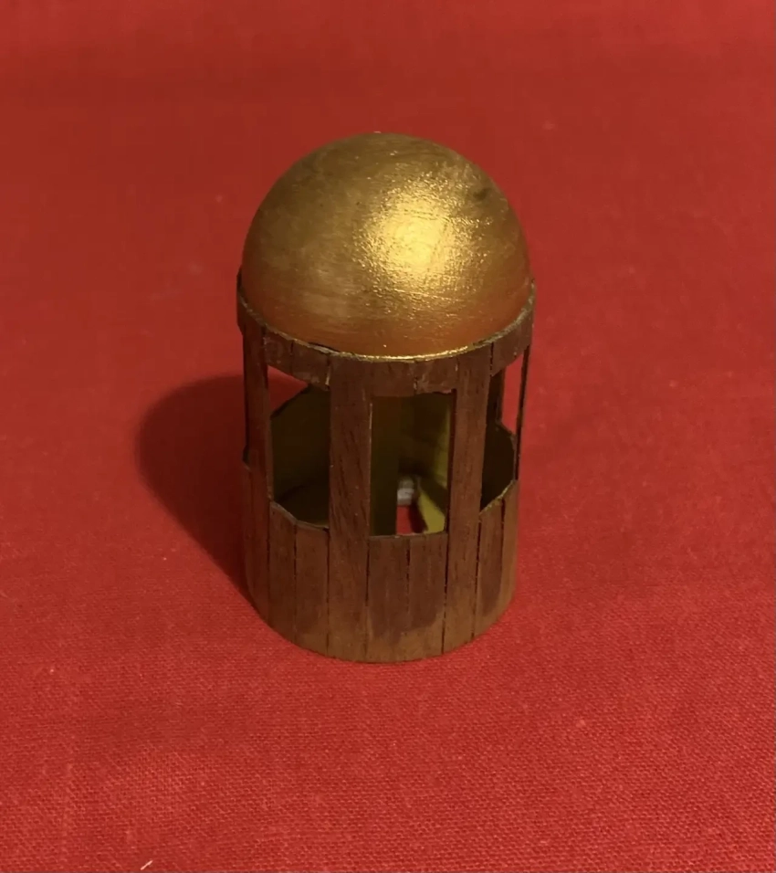 Основой башенки для лучников являются два диска для кукольных суставов диаметром 30 мм, склеенные между собой с помощью палочки для шашлычка. Высота получившегося цилиндра 40 мм. В нижнем диске заранее прорезается люк-лаз в подбашенное отделение. Доски, которыми «обита» башенка, имитируются полосками шпона фирмы «АВ-модель» шириной 4 мм. Они прекрасно склеиваются клеем ПВА. Полусферическая крыша – половинка деревянного шарика подходящего диаметра, также из магазина «Леонардо». Ее следует покрасить под медь или же под бронзу.