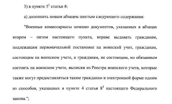 «Они будут направляться в личный кабинет гражданина на портале „Госуслуги“, что упростит и ускорит процесс оповещения. Постановка на воинский учёт также сможет осуществляться без личного визита в военкомат: на основании сведений из государственных информационных систем. Кроме того, жалобы на решения призывной комиссии также можно будет подавать в электронном формате».