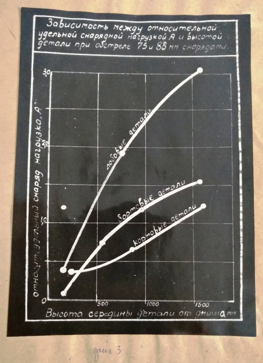 В отличие от ранее полученных данных, и на высоко расположенные кормовые детали приходится тоже значительная по величине относительная удельная снарядная нагрузка. Эта разница получилась как за счет отделения поражений 75 и 88 мм снарядами от поражений снарядами калибром 50 мм и выше, так, в значительной мере, и пополнением данных материалами 1944 г.