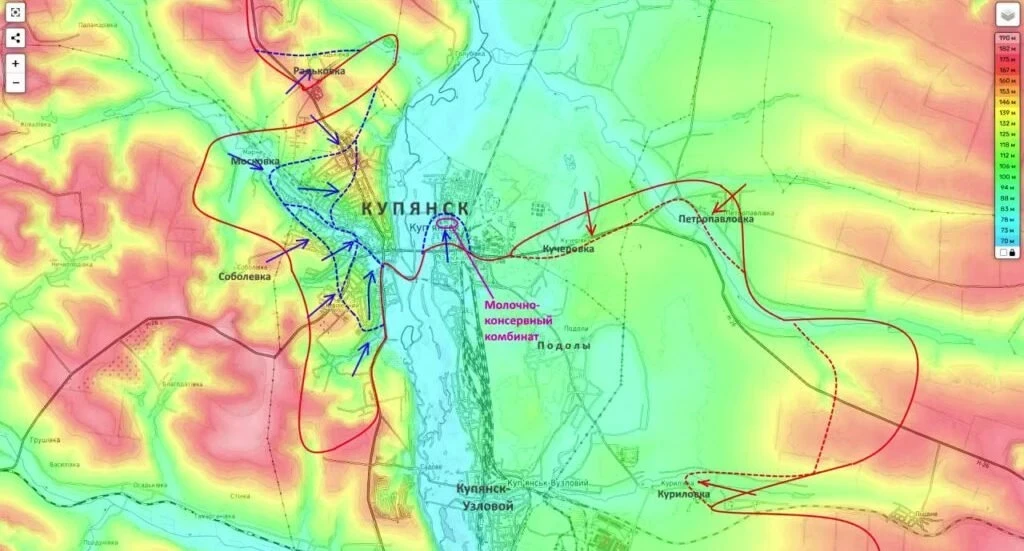Отдельно Подоляка сообщил о действиях российских штурмовых групп в районе молочно-консервного комбината. По его словам, средства объективного контроля фиксируют присутствие российских подразделений на территории предприятия. Он называет этот объект важным узлом обороны и считает, что удержание данной позиции может сыграть ключевую роль для закрепления на правом берегу реки Оскол. Эти данные официально не комментировались украинской стороной.
