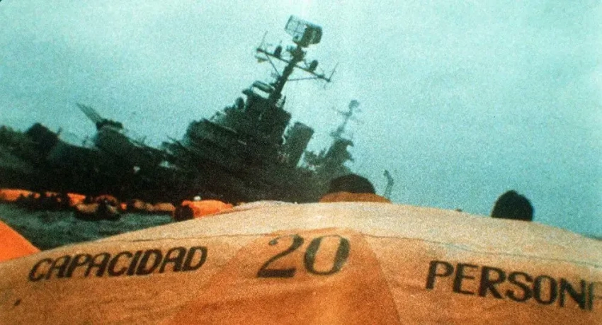 Тонущий «Бельграно» с другого ракурса. Качество так себе, но на корме видно двух человек: это капитан 1 ранга Эктор Бозо и старшина Рамон Баррионуэво, готовящиеся покинуть корабль последними
