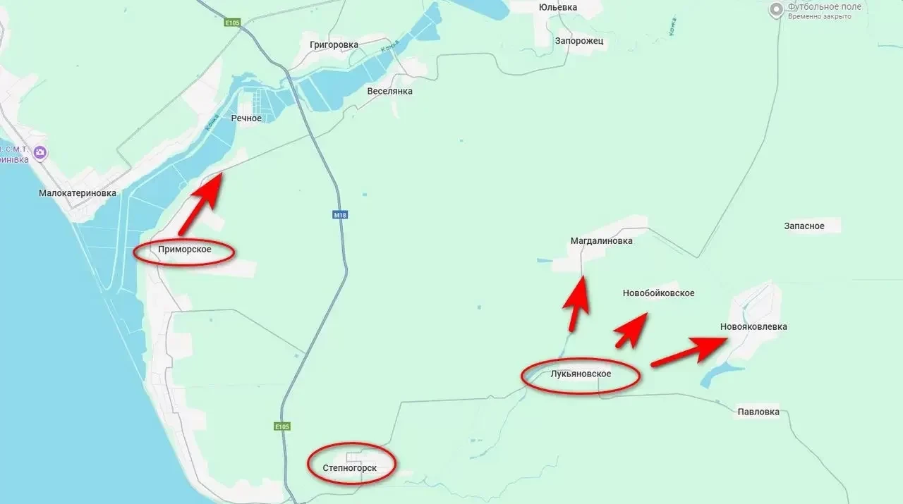 Также подтверждается информация, что наши уже пытаются пробиться к Речному, находящемуся севернее Приморского, но противник пока этого сделать не дает, используя очень большое количество FPV-дронов. Севернее Степногорска наши штурмовики зачищают позиции ВСУ в посадках, а также бьют по противнику в районе Веселянки. Со стороны Лукьяновского штурмовые группы накатываются на врага в районах Новояковлевки, Новобойковского и Магдалиновки.