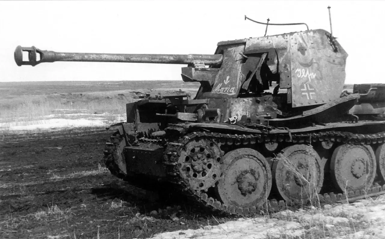 Вероятнее всего, члены экипажа этой самоходки 7.5cm Pak 40/3 auf Sfl.38 Ausf.H Marder II воссоединились со своими девушками Марией и Ильзой после того, как их машина получила тяжелое попадание в тонкую лобовую броню