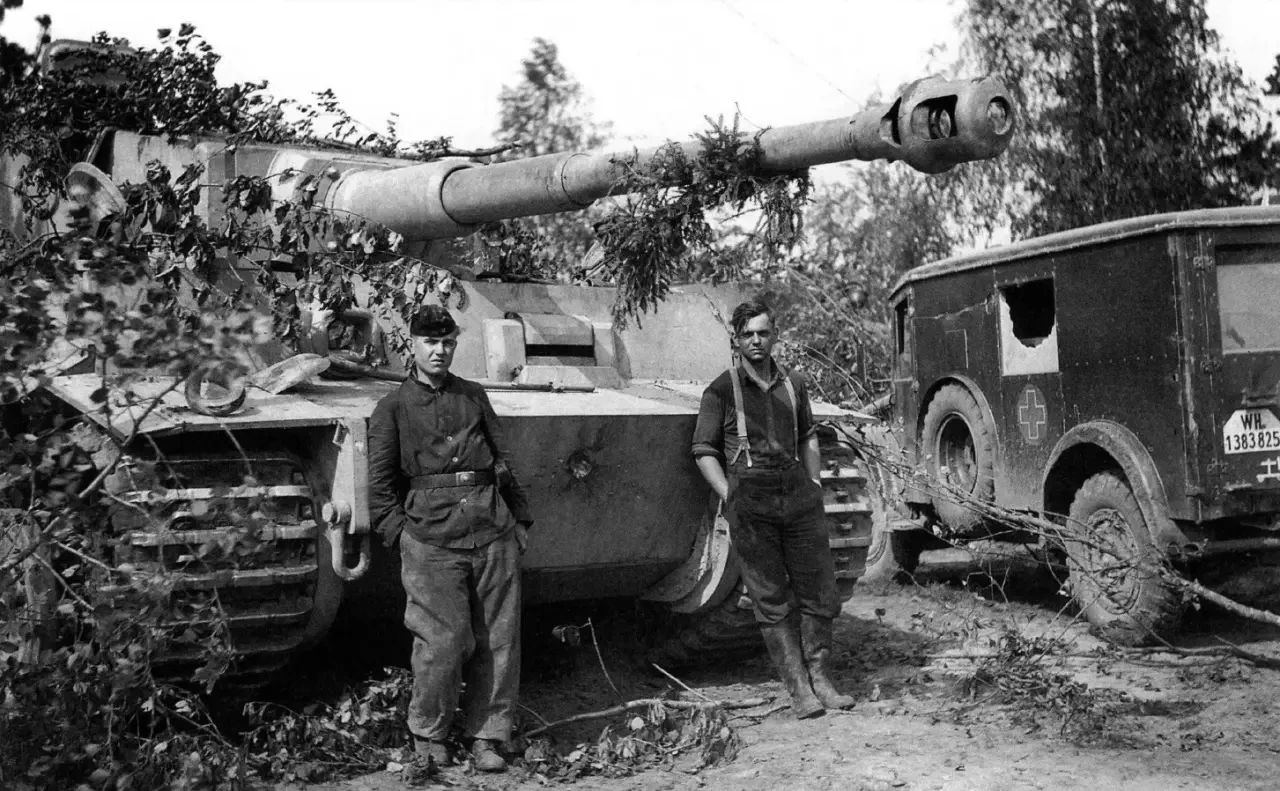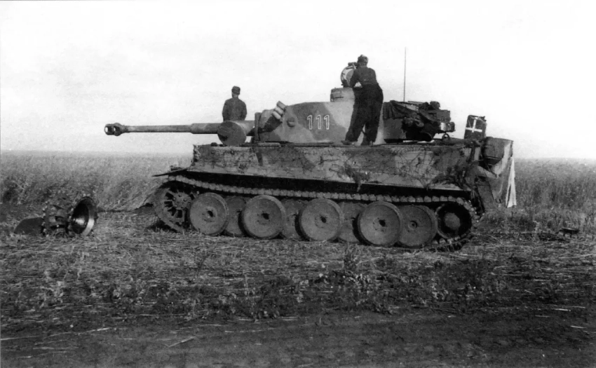«Тигр» с бортовым номером 131 из состава 503-го тяжелого танкового батальона (s.Pz.Abt. 503), завязший в грязи. Обратите внимание на эмблему батальона (тигр) и узкие гусеницы (транспортные траки), закрепленные на лобовой бронеплите в качестве дополнительной защиты. Этот снимок был сделан не на передовой, так как на заднем плане несколько человек принимают ванну