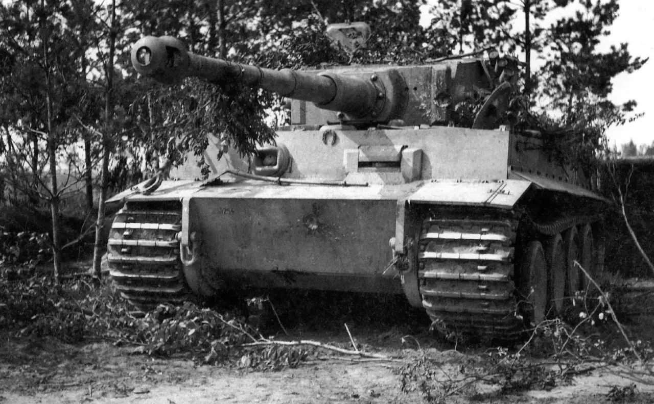 «Тигр» из состава 500-го тяжелого танкового батальона со снятой правой гусеницей. Экипаж внимательно вглядывается в горизонт – возможно, это означает, что они находятся недалеко от линии фронта. Или же они просто хотят быть уверены, что никто не украдет их сохнущее белье