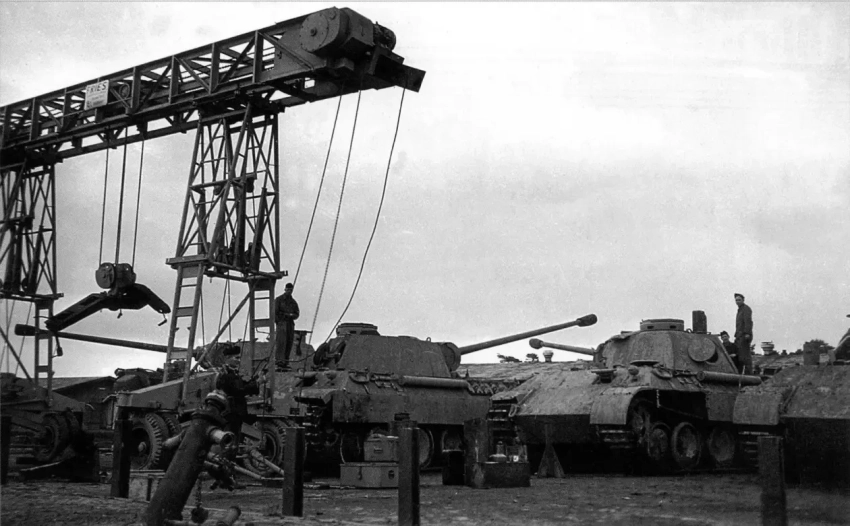 Для обслуживания новых танков «Тигр» и «Пантера» ремонтным подразделениям выдавались козловые краны. Это 16-тонная версия производства компании «Фрис» (Fries), поднятая во «внутреннее рабочее положение», при котором под ним может поместиться только один танк
