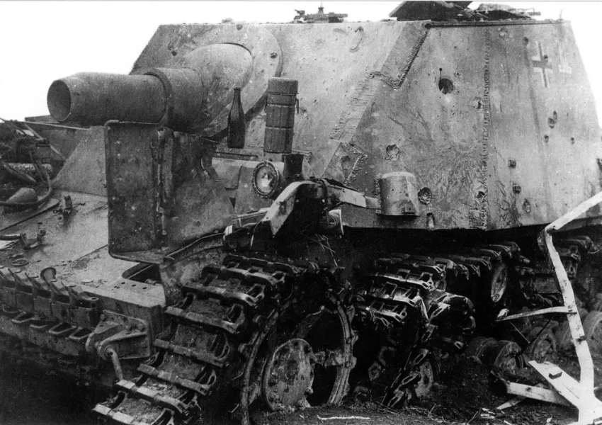 Можно с уверенностью предположить, что бутылку туда поставили уже после того, как этот «Штурмпанцер» был так сильно разбит. Маркировка римскими цифрами указывает на принадлежность этой машины к штабу 216-го батальона штурмовых танков (Stu.Pz.Abt. 216), действовавшего в СССР