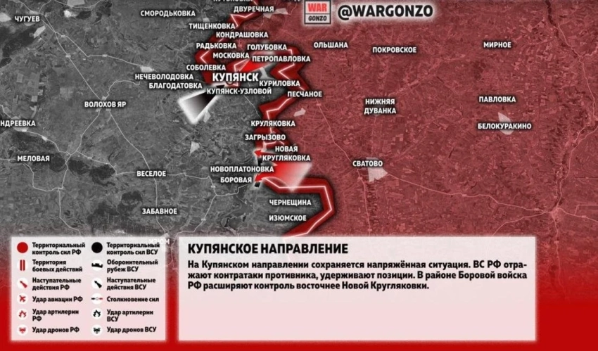 На картах, составленных на основе видеозаписей с привязкой к местности, подразделения "Запада" по-прежнему контролируют микрорайон Юбилейный до городского кладбища (за ним лес), весь центр, включая ж/д станции Купянск-Южный и Эстакадный, а также всю северо-западную часть, резюмировал специалист.