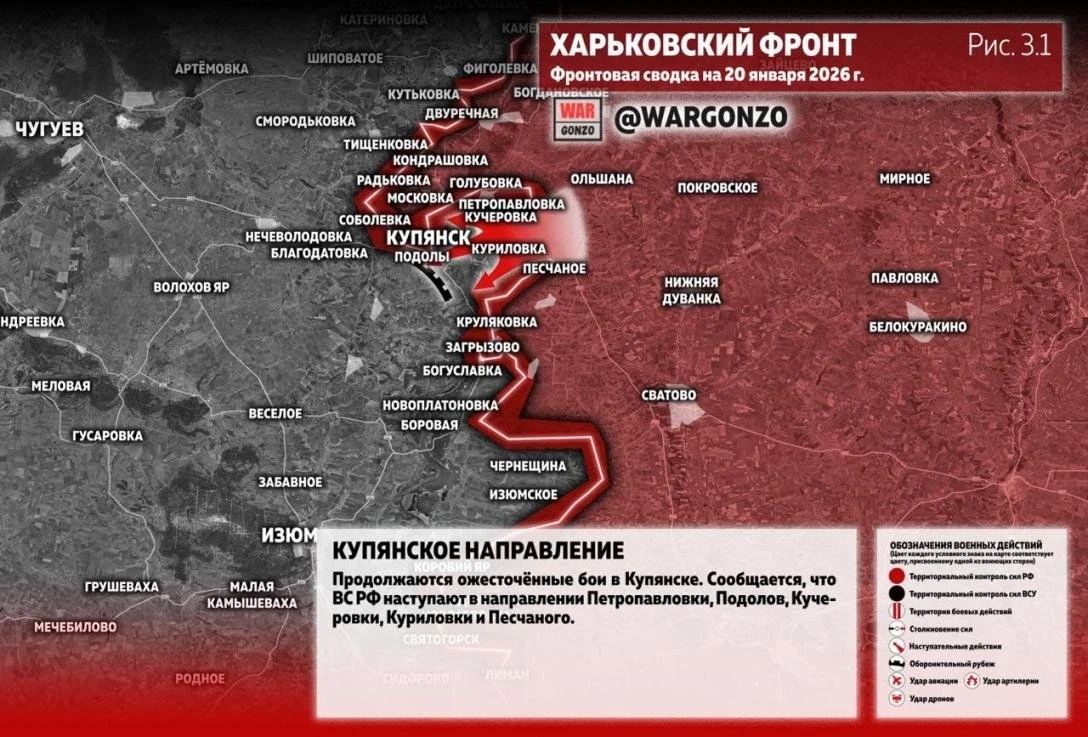 Карта боевых действий на Купянском направлении по состоянию на 20.01.2026