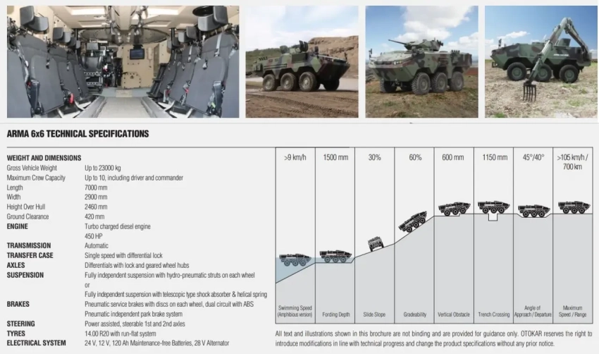 ARMA 6×6 – модульная бронемашина массой до 18,5 т (максимально допустимая – 23 т), предназначенная в первую очередь для перевозки десанта (8 чел. и 2 члена экипажа). Оснащена турбодизельным двигателем на 450 л. с., максимальная скорость 105 км/ч по шоссе, независимая гидропневматическая подвеска, запас хода до 700 км. Машина имеет амфибийные свойства.