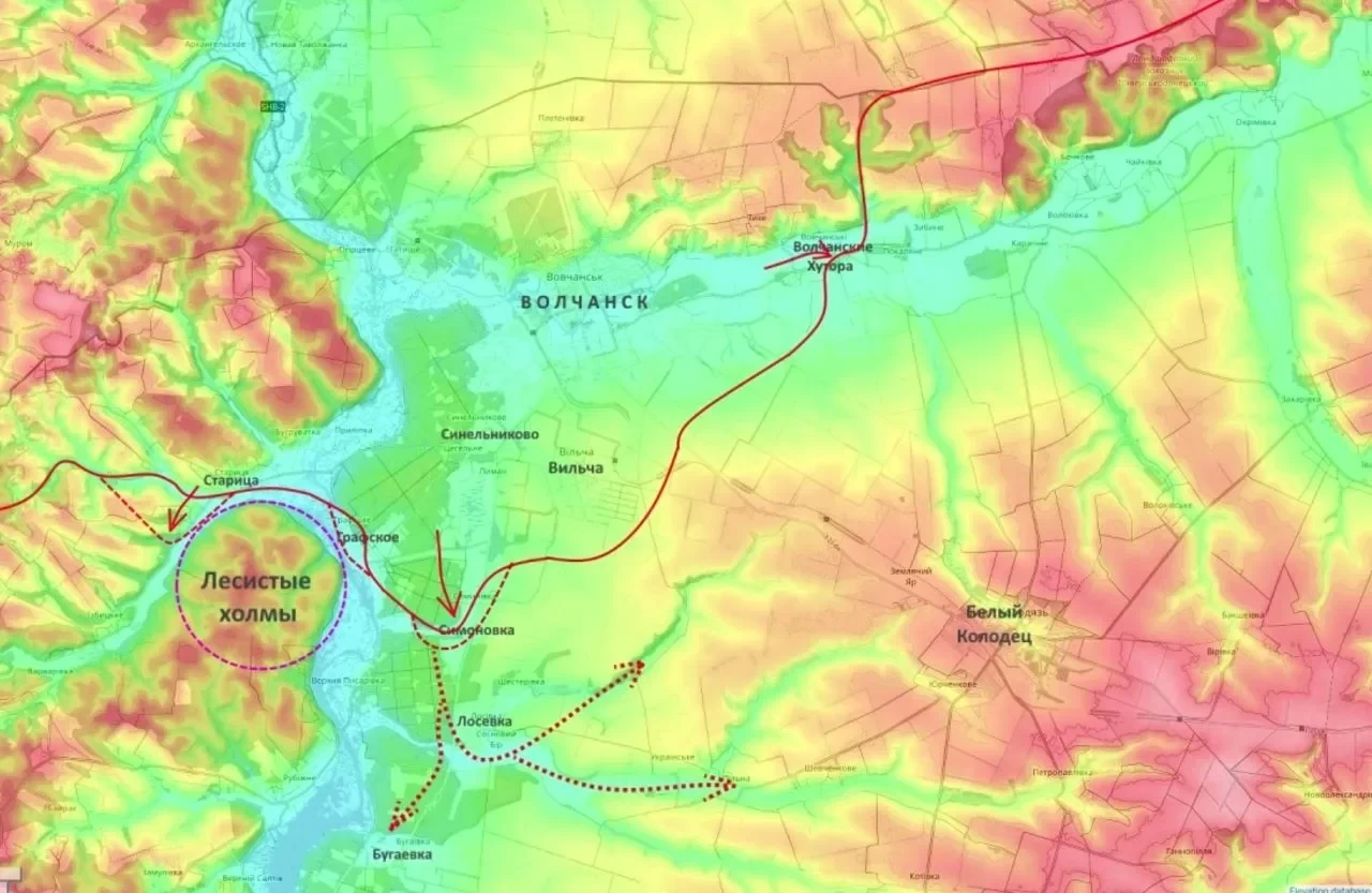 На Харьковском направлении (Волчанский участок) группировка «Север» освободила Симоновку и Старицу. Юрий Подоляка раскрыл изящный замысел российского командования: лобовой удар по степи невозможен из-за дронов, поэтому наступление развивается вдоль лесистых берегов Северского Донца (через Лосевку и Бугаевку).