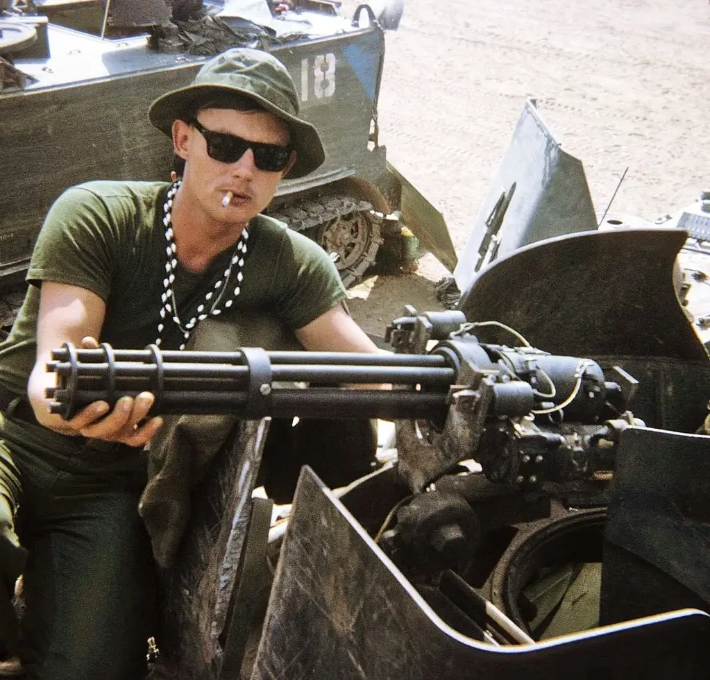 Боец эскадрона "Чарли" 3-го батальона 4-го кавалерийского полка 25-й пехотной дивизии демонстрирует пулемёт XM-134 (ранее армейское обозначение), установленный на бронетранспортёре М113. Откуда кавалеристы разжились не полагавшимся им по штату оружием, остаётся только гадать. Правило "тихо слямзил и ушёл, называется нашёл" действует в любой воюющей армии любого государства