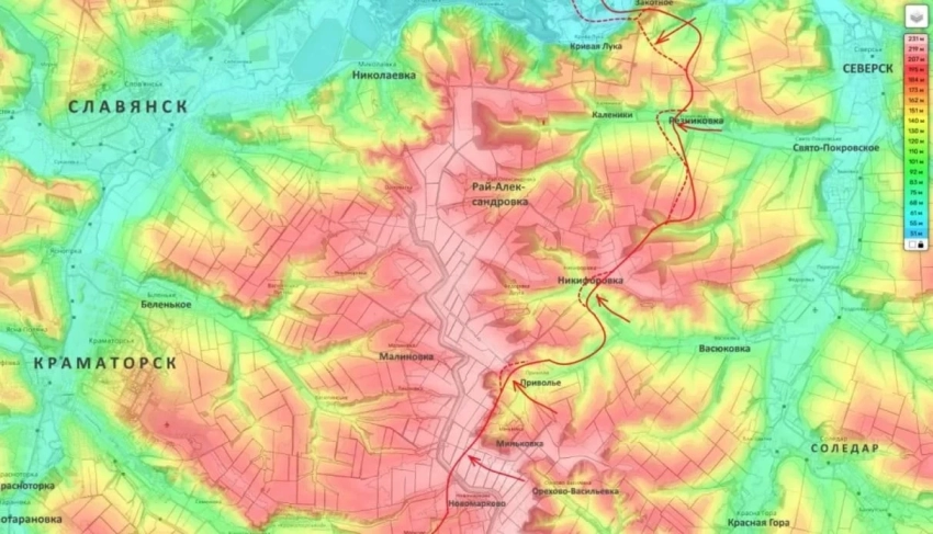 Если обратиться к Краматорско-Славянскому направлению, то здесь продолжается наступление третьей армии группировки "Юг". Подразделения ВС РФ, опираясь на занятые высоты в Закотном, начали зачищать территорию лесополосы южнее, где имели успехи.