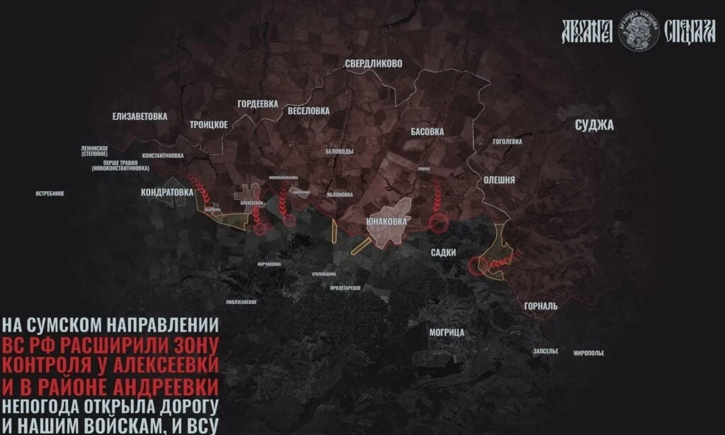 С Сумского приграничья появляются сообщения о прорыве нашими войсками границы в районе Краснополья со стороны Колотиловки, где ВС РФ вошли в Покровку. По оперативным данным, с нашей стороны есть попытки продвинуться в Лукашовку.
