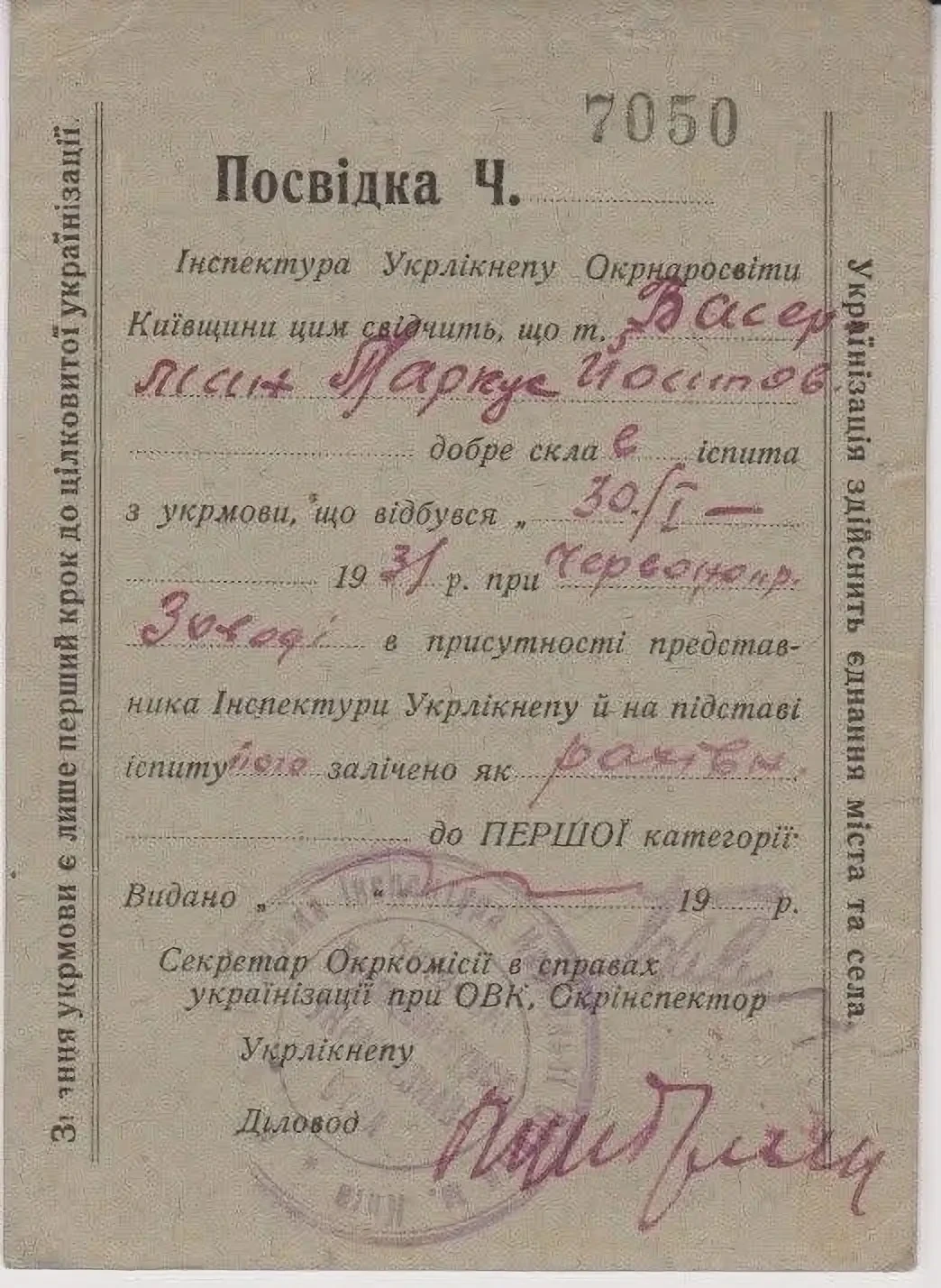 Я учитель, окончил в Минске университет и в настоящее время работаю преподавателем физики и математики в школе-семилетке в г. Бобре Крупского района (БССР). На работе я говорю только по-белорусски. Если, увлекаясь, скажу что-нибудь по-русски, то сейчас же поправляюсь, слежу за собой. Но в личной семейной жизни я говорю по-русски просто потому, что на этом языке мне легче говорить. И вот случился инцидент. Записку на имя председателя сельсовета я случайно написал по-русски. И в то время в школу прибыли завуч районов Чепель и председатель райкома союза т. Голованов. Они выступили с моей запиской на собрании просвещенцев, заявив, что эта записка фигурировала на пленуме райисполкома и райкома КП(б)Б и будет фигурировать на сессии ЦИК БССР. Меня обвинили в махровом великодержавном шовинизме. Выступив, я признал свою ошибку в деле с запиской. Тут же я подтвердил, что дома всё время говорю на русском языке, но не вижу в этом ничего неправильного. После моего объяснения обвинения усилились. Мне объявили, что дома, в разговоре с женой, я должен употреблять исключительно белорусский язык.