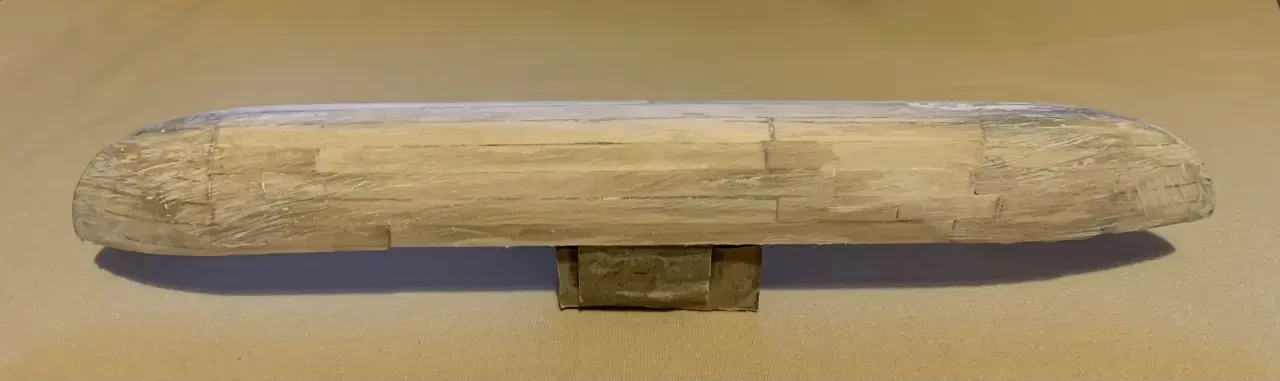 Готовый корпус сначала ошкуривался. Затем шпаклевался, при этом использовалась смесь ПВА и мелких опилок. После чего обработанный таким образом корпус снимался с пластилиновой формы, и к нему спереди и сзади, по фотографии модели Френсиса Пиммеля, пристыковывались вытянутые вверх оконечности. Изнутри корпус прямо по бумаге отклеивался рейками из ольхи шириной 3 мм.