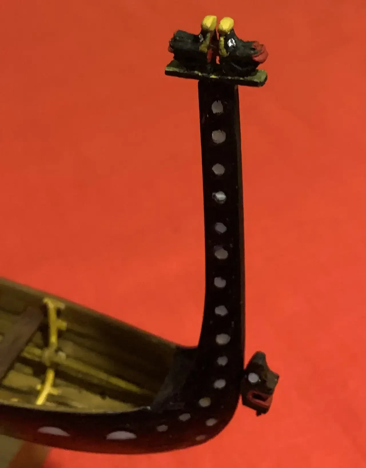 Фигурки на форштевне на «голова» вырезаны из липы модельным ножом и борами и тоже скопированы с модели Френсиса Пиммеля. Глаза нижней головы тоже из перламутра! Другая еще не покрашена