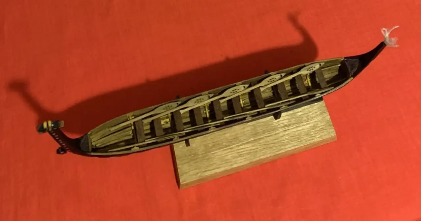 Много работы было с установкой декоративных шпангоутов. Мало того, что в сечении они полукруглые, так под них еще и короткие деревянные отрезки подложены. И всё это надо сделать аккуратно! Для самих шпангоутов использовались полистироловые прутки шириной 2 мм, а отрезки под них — из таких прутков той же толщины фирмы «СВ-модель». Два продольных стрингера — железные прутки диаметром 1,5 мм с надетыми на них полистироловыми колечками там, где они касаются шпангоутов. Если уж очень понадобится, то в Интернете можно найти фотографии с внутренним видом таких пирог. 10 штук таких шпангоутов сразу же после склеивания нужно осторожно выгнуть, например, с помощью паяльника, поставленного на самый слабый нагрев (можно еще и бумагой обернуть!), и сразу вставить в корпус. С другой стороны, наверное, если у тебя «модель для себя», то можно их и не делать, ограничившись лишь поперечными банками для гребцов.