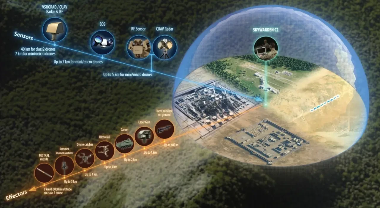 В составе Sky Warden должны работать разные средства перехвата или подавления. Так, на дальностях до 300-400 км предлагается использовать наземные пусковые устройства с улавливающими сетками или поражающими элементами. Также в систему могут интегрировать боевые лазеры, станции РЭБ, артиллерийские и ракетные системы. Дальний рубеж перехвата — ракеты Mistral с дальностью 8 км и высотой до 6 км.