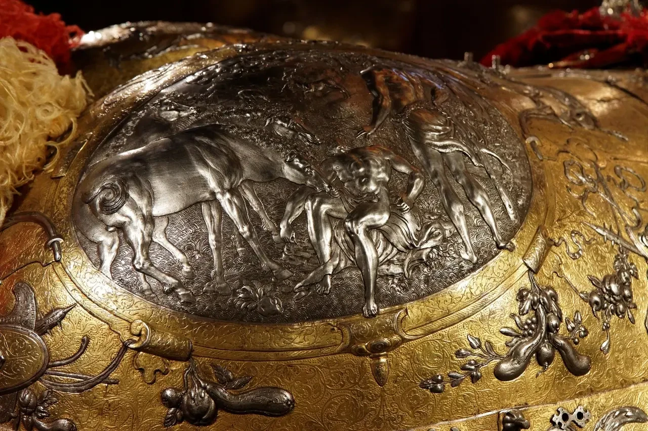 Доспехи эти представляют собой полный гарнитур, включающий и сам доспех для всадника, и абсолютно полный бард, то есть доспехи для коня. По сути дела, это даже и не доспех вовсе, а своего рода произведение доспешного ремесла и искусства: «чистейшей прелести чистейший образец» (А. С. Пушкин). Причем, несмотря на самое пышное оформление, какое только можно себе представить, отделаны они с таким вкусом, что в них нет ничего лишнего. Как об этом уже здесь сообщалось, доспех короля Эрика получил название «Доспеха Геракла», а все потому, что основными мотивами чеканных изображений на нем стали 12 подвигов Геракла, а также события из истории Троянской войны и плавания аргонавтов. Причем всю поверхность гарнитура украшает орнамент, и к тому же все его украшения либо позолочены, либо посеребрены. И очень важной деталью являются парные фигурки Пегаса, выбитые на забрале. Это не просто так, не просто фантазия мастера – это еще и «говорящий» символ красноречия владельца доспеха, в котором Эрик по задумке должен был предстать перед королевой-девственницей Елизаветой Английской.