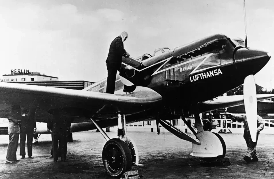 Легендарный герой Первой мировой войны, генерал Эрнст Удет (слева на переднем плане) и Эрнст Хейнкель с коллегами. На заднем плане самолёт-рекордсмен. Снимок сделан 07 июня 1938 года, на следующий день после рекордного полёта